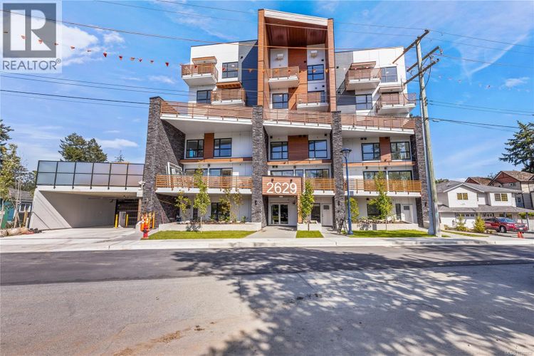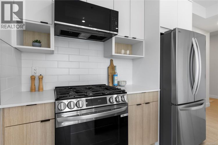 SHORT TERM BUYER INCENTIVE OF $10,000 ON 1 BED AND $15,000 ON 2 BED UNITS - Welcome to Millstream Residences. This functional and thoughtfully designed TOP FLOOR 1 bedroom unit home offers 657 sqft of living space with balcony, perfect to enjoy during the warm summer months. The open living space features oversized windows that flood the space with tons of natural light, durable neutral flooring and matte black hardware and details throughout that anchor the home. The kitchen features SS LG appliances, quartz countertops and island and two-tone cabinetry with ample room for storage. The building features a large outdoor space where you can connect with your neighbours and enjoy the green spaces, seating, fire tables, BBQ’s and playground. Centrally located in the heart of Langford, you are just minutes from amazing amenities and recreation, schools, hiking trails, parks and lakes. PRICE + GST - 2 PARKING STALLS INCLUDED (id:26452)