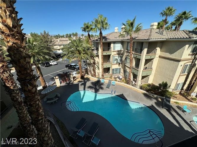 Tropical Resort Living, Beautiful 3rd Floor Condo, 2 bedrooms, 2 bathrooms, balcony overlooking pool, all appliances are included, living room with fireplace, dining area, all appliances included, primary bedroom with walk in closet. 3 Pools with Spas, Gym, Club House, Tennis Court, Gated, Easy access to freeway 215, airport, Strip, walking distance to the new Durango Hotel & Casino.