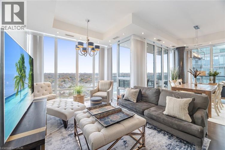 Remarkable Luxury Living in this incredibly spacious condo offering almost 1,900 sqft of interior living space plus 300sqft of wrap-around terrace and second balcony. A truly expansive lifestyle experience featuring 3 large bedrooms + enclosed den and 3 bathrooms. Enjoy floor-to-ceiling windows, 10-foot ceilings, and custom Hunter Douglas remote-controlled window coverings that frame panoramic city and lake views. The large open-concept layout is complemented by custom cabinetry, a walk-in laundry room, and a separate walk-in pantry/storage room-all designed for convenience and modern living. The residence includes two luxurious 5-piece bathrooms adorned with marble finishes and a 2-piece powder room. The unit has been freshly painted. Enjoy the convenience of 2 (side-by-side) parking with a fully installed EV charger, plus one locker for even more storage. Residents enjoy access to over 30,000 sqft of resort-style amenities, including indoor and outdoor pools, hot tubs, a state-of-the-art fitness centre, basketball/pickleball court, party rooms, billiards, a lounge, 24-hour concierge, free visitor parking, and much more. A rare opportunity to own one of the largest and most desirable suites in the building-offering unparalleled space, style, and amenities in an unbeatable location. (id:26452)