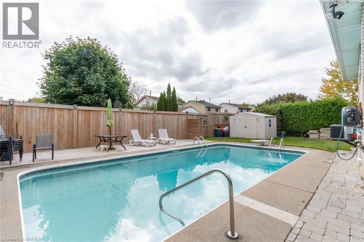 North End all angelstone brick raised ranch style family home with wide 57 ft frontage lot & heated inground pool for summer fun steps to schools! Featuring open concept newer stunning eat-in kitchen, dining room & living room with hardwood floors- perfect for entertaining! 2+1 bedrooms, 2 full baths, could have 4th bedroom on lower level if needed, finished rec room with gas fireplace and built in book shelves with desk, nice covered sun screen deck that blocks UV sunlight, newer windows with 2 bay windows in living room & dining room, newer reshingled roof, furnace, central air, newer insulation, fridge, stove, dishwasher, microwave & 2 TV's on the walls are included, double paved driveway, attached garage with auto opener, security system, fenced yard. Close to shopping and easy Hwy 403 access just off the Wayne Gretzky Parkway. Room to park RV, trailer or boat on side of home with gravel base. Immediate possession. A Must See! (id:26452)