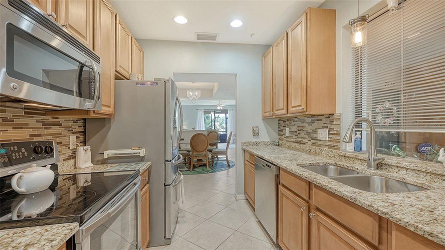 Step into the screened lanai off the living room, where you can relax and enjoy the tranquil stream just outside your door, surrounded by beautiful wildlife—perfect for savoring your morning coffee or evening drink. The galley kitchen features granite countertops, all-wood cabinetry, and stainless-steel appliances, complemented by a spacious pantry for all your culinary needs.