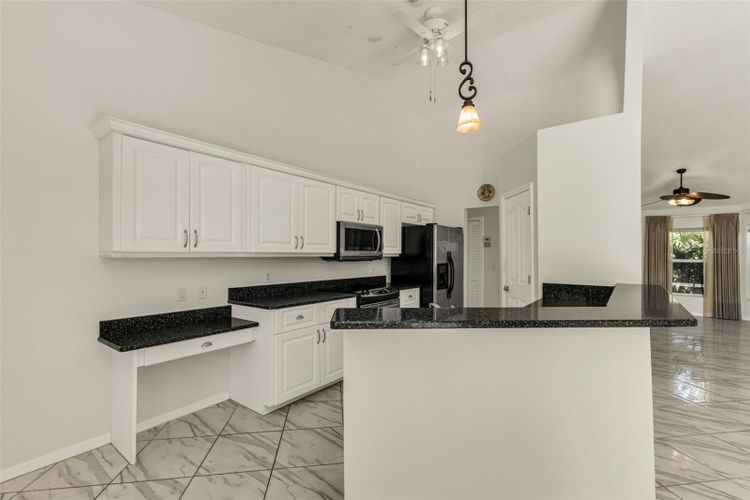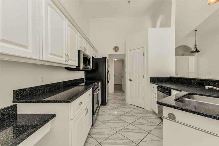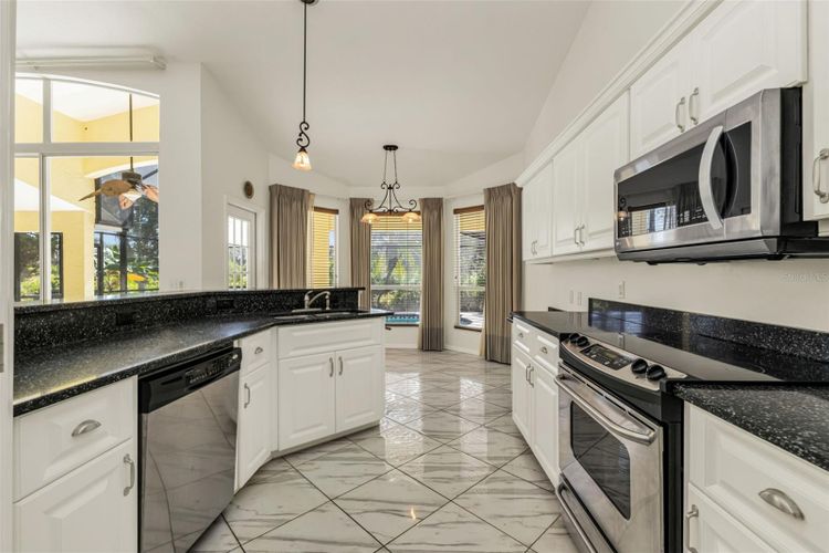 This beautifully appointed 3-bedroom, 2-bathroom, 2-car-garage residence offers the perfect blend of comfort, privacy, and resort-style living. Step inside to find vaulted ceilings, a light and bright open floor plan, and a stylish kitchen featuring granite countertops, stainless steel appliances, and a dining area with windows overlooking the lanai and pool. The spacious primary suite offers walk-in closets, sliding door access to the lanai, and an ensuite bath with dual sinks, a garden tub, and a separate step-in shower. On the opposite side of the home, two guest bedrooms provide privacy—one with its own door leading to the lanai. The guest bath includes dual sinks and a step in shower. A large indoor laundry room with a utility sink and custom window treatments complete the interior.