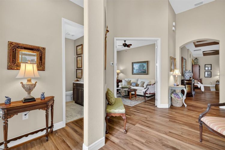 Welcome to 8464 Bridgeport Bay Circle in the highly sought-after Lakes of Mount Dora. This beautifully maintained Granada model features 2 bedrooms, 2 baths, a den, and a private pool, designed for those who appreciate elegant, thoughtful details and a vibrant 55+ active adult lifestyle. This 2,033-square-foot home centers around a great room, where soaring coffered ceilings and abundant natural light create a bright, inviting atmosphere. A cozy reading nook provides the perfect spot for quiet reflection or enjoying a favorite book, while still being part of the open, flowing layout ideal for entertaining and daily living. Built in 2018, the home features an entertainer’s dream kitchen anchored by GE Profile stainless steel appliances, including a 5-burner natural gas cooktop with a custom-designed range hood, pristine quartz countertops, 42-inch cabinetry, and subtle under-cabinet lighting. A dry bar with wine fridge adds a touch of sophistication, while the eat-in area, highlighted by a sun-drenched bay window with built-in bench, creates a cheerful, cozy spot for breakfast, snacks, or afternoon tea. An island with barstool seating provides additional casual dining and gathering space. The primary suite is a private oasis, offering ample space for a king-sized bed, dual vanities with quartz countertops, a curbless shower with built-in bench, and a private water closet. Elegant plantation shutters complete the space, offering customizable light and privacy. Access your private retreat through a wall of three glass pocket doors onto the lanai and private pool, seamlessly blending indoor comfort with outdoor leisure — perfect for morning coffee, entertaining, or relaxing in the Florida sun. Residents enjoy a wealth of resort-style amenities, including an 18,000-square-foot clubhouse, resort-style pool, tennis and pickleball courts, bocce ball, a croquet lawn, four miles of interconnecting waterways, scenic trails, inviting fire pits, and gated RV and boat parking. The HOA fee of $280/month includes internet, cable, irrigation, and access to numerous clubs and activities. Golf enthusiasts will appreciate nearby access to the Country Club of Mount Dora, while the vibrant towns of Mount Dora and Eustis offer art galleries, festivals, restaurants, and shopping. For weekend adventures, beaches and theme parks are just a 45- to 60-minute drive away. This home seamlessly combines elegant living spaces, modern amenities, and an active lifestyle, making it ideal for those seeking comfort, leisure, and community in Central Florida’s Lakes of Mount Dora. Experience the perfect balance of indoor elegance and outdoor enjoyment, along with the myriad lifestyle opportunities of this welcoming 55+ community.