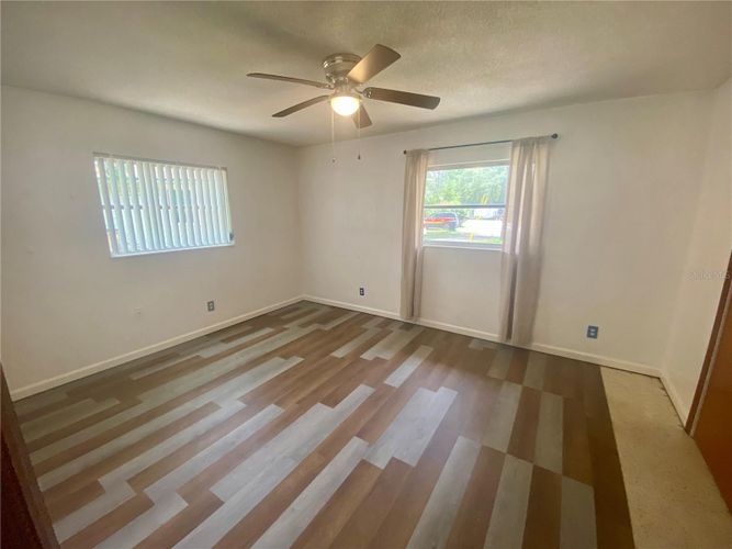 Ready to move in now. NEW ROOF MAY 2025! Positioned on a very quiet peaceful attractive cul-de-sac. Home is very light and bright bringing the outside inside with lots of natural light. Two bedrooms and 1 Bathroom with an open spacious split floor. The kitchen is open and large with lots of cabinets. The Great Room is 17 x 13 nice and spacious which opens up to the screeded room and kitchen area. Seller has recently improved the following: Full roof replacement in May 2025, Exterior and Interior freshly painted and brand new-flooring in the kitchen and bedrooms. Great backyard with a private and serene setting. Garage has a lot of storage and work space and added additional power supply to garage. Amazing location. Minutes to Downtown Mount Dora, shopping, public boat ramps, hospitals and much more. Schedule your showing today!