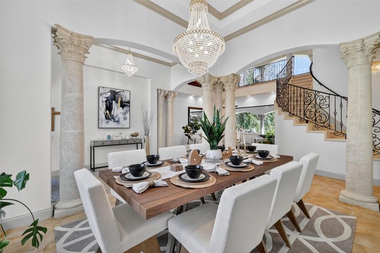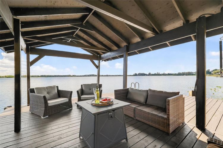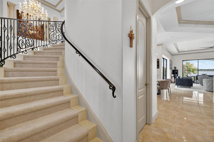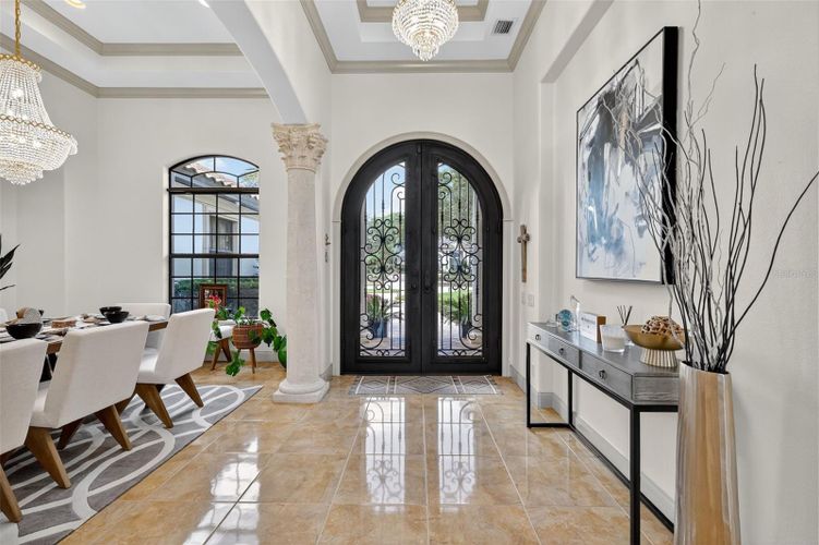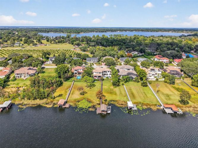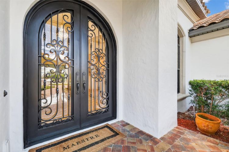 Welcome to a WORLD OF ELEVATED LIVING in this EXQUISITE MEDITERRANEAN- INSPIRED, CUSTOM BUILT LAKEFRONT ESTATE gracefully positioned within the PREMIER GATED COMMUNITY of Loch Leven, just 2.5 miles from the charm of Downtown Mount Dora. Set on 2.95 meticulously landscaped acres, this grand residence offers 5,441 square feet of refined design, comfort, and sophistication. This thoughtfully crafted home features five bedrooms, including two private primary suites, an executive office (with plumbing for an additional bathroom), a formal living and dining room, a spacious family room that flows seamlessly into the kitchen and casual dining space, and a vibrant game room with an adjoining lounge—perfect for entertaining or relaxing with family and friends. The luxurious primary suite on the second floor is a true retreat, featuring a private flex room that can serve as a home office or sitting area. A custom wet bar with a refrigerator makes it effortless to enjoy your morning coffee or evening drink without leaving the suite. Step outside to the beautiful private balcony overlooking the sparkling pool and tranquil lakefront — the perfect spot to unwind and take in the views. The suite also features a custom-designed walk-in closet, offering abundant storage and elegant organization. The spa-inspired ensuite boasts a relaxing jacuzzi tub, a spacious walk-in shower, and refined finishes that create a serene, resort-like atmosphere. The first-floor primary suite offers its own private entrance from the pool area and includes a beautifully appointed ensuite bathroom, making it perfect for guests or multi-generational living. Bedroom three is tucked behind a pocket door and features its own ensuite bath for additional privacy. Bedrooms four and five share a full bath and are separated by a hallway with a pocket door, creating a quiet and private guest wing. The split layout of the home ensures maximum privacy and functionality throughout. From the moment you enter through the wrought iron and glass double doors, you're welcomed by soaring ceilings, crystal chandeliers, and a dramatic spiral staircase—bathed in natural light from expansive windows showcasing panoramic lake views. Pocket sliders open wide to a stunning outdoor living space featuring a resort-style saltwater pool, a custom outdoor kitchen, and a lanai with a second full outdoor kitchen—perfect for hosting unforgettable gatherings. A beautifully designed walkway leads you from the lanai directly to your private, extended dock with a new boat lift (2024), offering direct access to the spring-fed waters of Loch Leven Lake. Luxury upgrades include new carpet (2025), fresh interior paint (2024), two new HVAC units with smart thermostats (2024), exterior paint refresh (2025). Additional features include a three-car garage with EV charger, tile roof, mosquito misting system, lush landscaping with mature agricultural trees, and timeless architectural details that blend elegance with comfort. Residents of Loch Leven enjoy a vibrant yet tranquil lifestyle with amenities including tennis and pickleball courts, a playground, a community boat ramp and dock, and private on-site storage for boats, RVs, and recreational toys. A secured storage space is currently reserved for this property and may be retained by the new owner. Make this your dream home—where luxury, serenity, and elegance come together in perfect harmony in one of Mount Dora’s most sought-after communities.