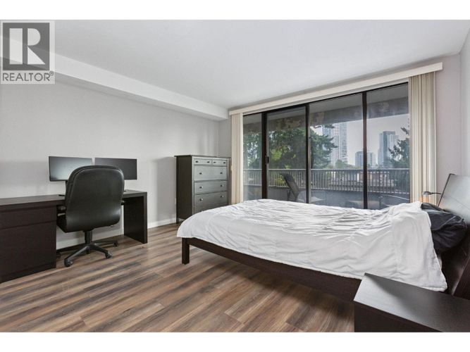 Welcome to home Huntley Manor at Central Park in Metrotown! This two bedroom corner home is spacious throughout with large room sizes & a covered balcony with access from living room & bedroom. Recently painted, laminate flooring, freshly renovated bathroom, east facing & insuite laundry! One secured underground parking stall & one storage locker included. Concrete building that is built to last, proactive strata including re-piping done in 2023 & low strata fee that covers heat, hot water, gym, squash court, billiards, table tennis & party room. Centrally located near Central Park, Metrotown, Crystal Mall, T&T, SkyTrain, library, community center, restaurants & more. This home is perfect for a first time buyer, investor or family in a superb location.