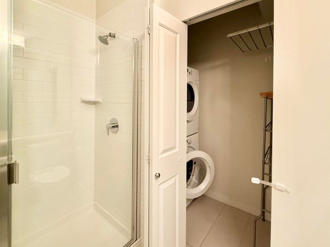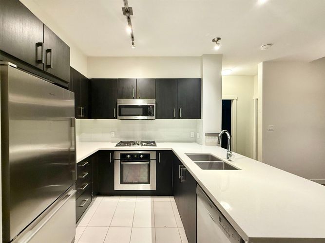 Stunning Penthouse at Polygon built "New Water"! This gorgeous top floor, 2 bedroom, 2 bathroom and 1 den offers 14 foot ceilings, an open floor plan, and a bright, open outlook with a generous sized balcony. High end finishings includes dark rich hardwood flooring, quartz countertops, gas stove and stainless steel Bosch appliances. Building offers a Westcoast modern architecture with the use of concrete, brick, steel and wood. Amenities include recreation room and gym. Enjoy this new and exciting waterfront neighborhood with the boardwalk & community centre close by! 1 parking included.