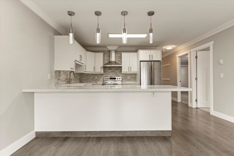 Be impressed by this large THREE BEDROOM corner condo at McIntosh Village! You'll love the floor to ceiling renovations and an abundance of living space. This suite features trendy laminate floors, updated LED lighting, crown molding, and in-suite laundry. A gorgeous white kitchen with quartz counters and an eating bar is the focal point of the open living area and offers plenty of cabinetry. From the living area, step out onto the private balcony with mature landscaping all around. The bathroom is also beautifully updated with slate tile and white cabinetry. You'll love the in-condo storage room, affordable strata fees, and pet friendly community. Conveniently located between Sardis and Chilliwack's rejuvenated downtown, this condo is the ideal home for a first time buyer. SHOWS A TEN!