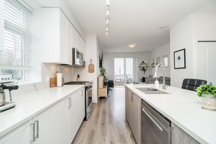 END-UNIT situated in a prime, quiet location at end of cul-de-sac, at Canopy by Qualico. Beautiful 2 bed w/ den, 2.5 bath home offers expansive windows, allowing for ample natural light. Gourmet kitchen w/ large island, quartz counters, SS appliances and gas range, along with spacious balcony w/ gas hook-up off the living room, allowing for seamless indoor-outdoor living. Lush green space and beautiful trails at Tynehead Park, situated at the side of the home, offering nature and privacy. Large primary bedroom plus second bedroom upstairs, along with two full bathrooms, including the spa-inspired en-suite. Single-car garage plus driveway, front + side yard. Quick access to Hwy 1, shopping, schools and transit plus club house and exercise centre. A great location, perfect for families!