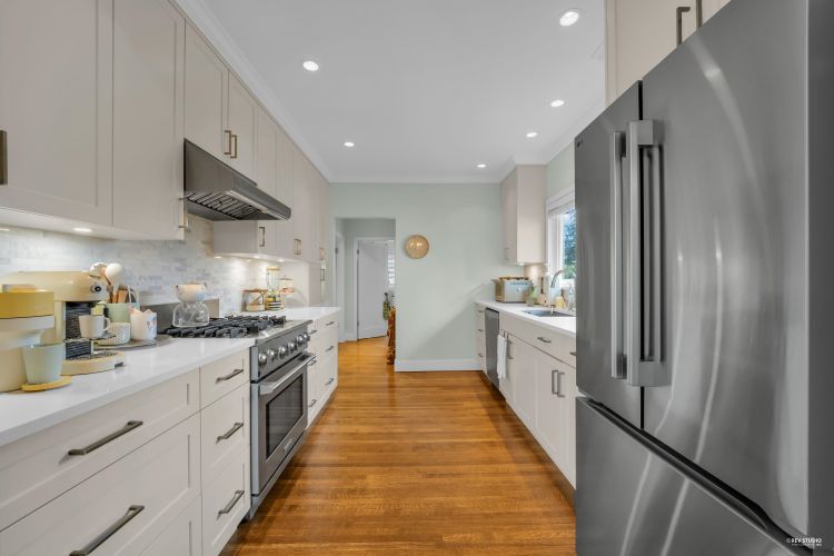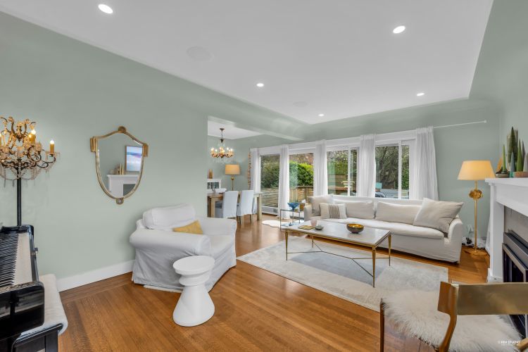 Tucked away on a quiet, sun filled corner lot on Braeside Street, this family home offers exceptional privacy w/ sweeping mtn & southwest sunset views, plus potential for meaningful water views from a future second level made possible with the elevation. The home spans 1,977sqft over 2 lvls & features a bright, open layout ideal for everyday living & entertaining. Highlights include a generous living area w/ a classic fireplace, an elegant dining space w/ large picture windows & sliding doors & a custom kitchen w/ premium appliances. 3 well-sized beds, including a primary suite w/ peaceful garden & sunset views, along w/ H/W floors, all new windows, a large recreation room & a covered veranda overlooking private, child-friendly gardens. Mins to PR, Ambleside, Ridgeview School & DT Van.