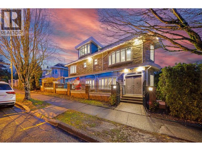 Excetional spacious uniquely designed custom-build home in Vancouver’s highly desirable Fraserview neighbourhood. This well-maintained residence offers a living space with 7 bedrooms and 6 bathrooms, perfect for large families. The layout features large windows that fill the home with natural light. Elegant details include granite countertops, spiral staircase, artfully ceiling moulding with architectural finishes, a gourmet kitchen with wok/spice kitchen for entertaining. The private upper-level primary suite features a rooftop sundeck with city views. A 2-bedroom basement suite with separate entry provides excellent mortgage helper. Enjoy radiant heat, a fenced backyard, solarium & landscape. This home like a brand new move in condition with lot of upgrades. OpenHouse Sun Mar 22nd 2-4 pm