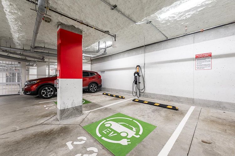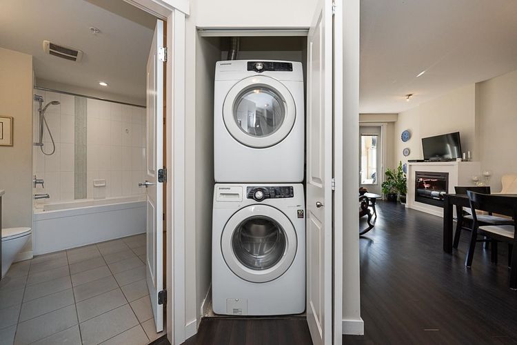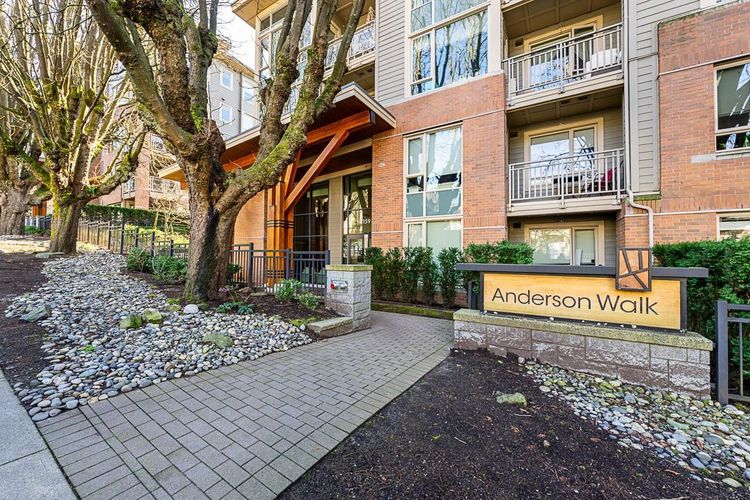 Anderson Walk by Polygon! South facing onto the quiet courtyard with a private balcony and tons of natural light. Large square footage offers an organic, livable flow and truly open living space. Spacious kitchen with pantry space, full size stainless steel appliances, granite countertops, and a gas range. Radiant in-floor heating! Building amenities include a well appointed gym, 2 bike rooms, party room and guest suite. Located on a quiet, tree-lined just steps to shopping on Lonsdale. Great parking stall underground. Pet friendly building!
