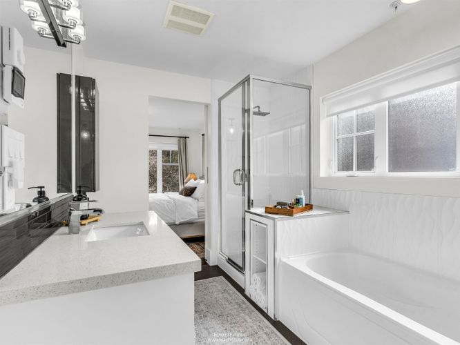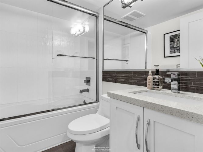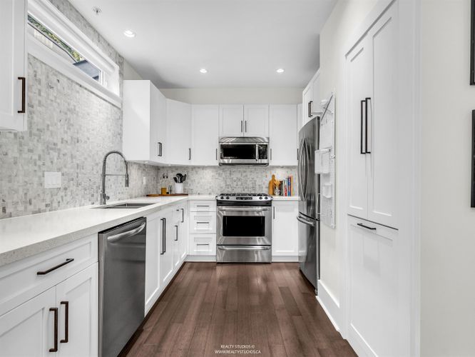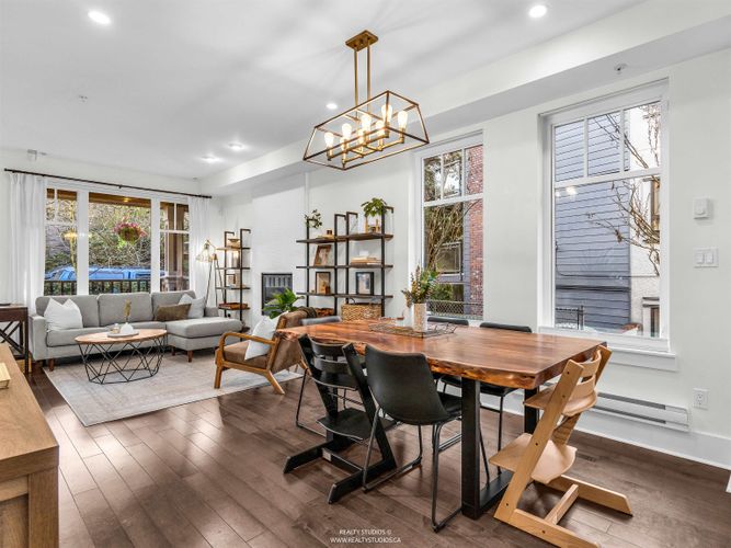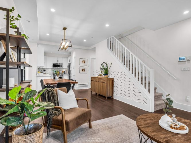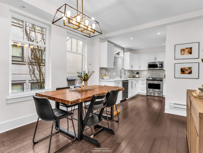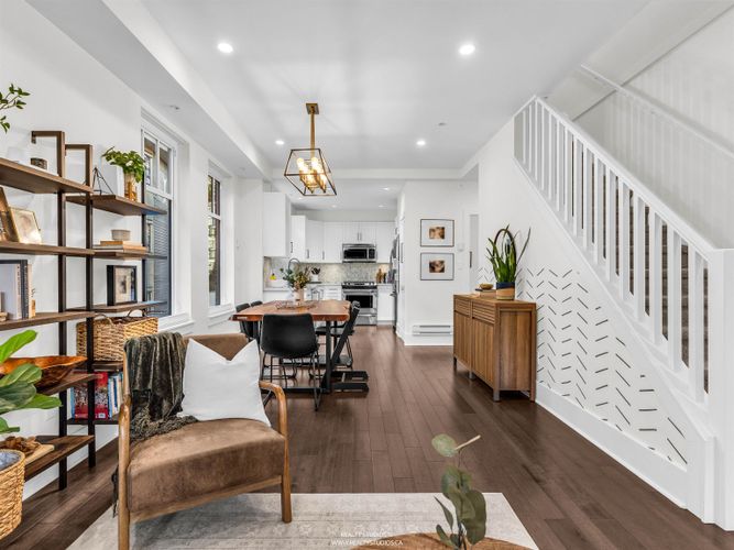 Tucked in a boutique strata on one of Mount Pleasant’s coveted cherry blossom-lined streets, this sun-drenched, south-facing townhouse offers bright open-concept living with 9’ ceilings and wood floors, opening to a private fenced yard. The kitchen shines with quartz counters, marble mosaic backsplash, stainless steel appliances (including gas range), and custom pantry/built-ins. Upgrades include voice-controlled lighting, Mysa thermostats, pot lights, custom window coverings, new hot water tank, and Wi-Fi security. A permitted lower-level renovation (2024) adds a versatile bedroom + rec room with direct access to secure underground parking. Walk Score 100: Michelin star restaurants, breweries, and coffee shops, as well as the new Skytrain station, schools, parks, community centre/library!