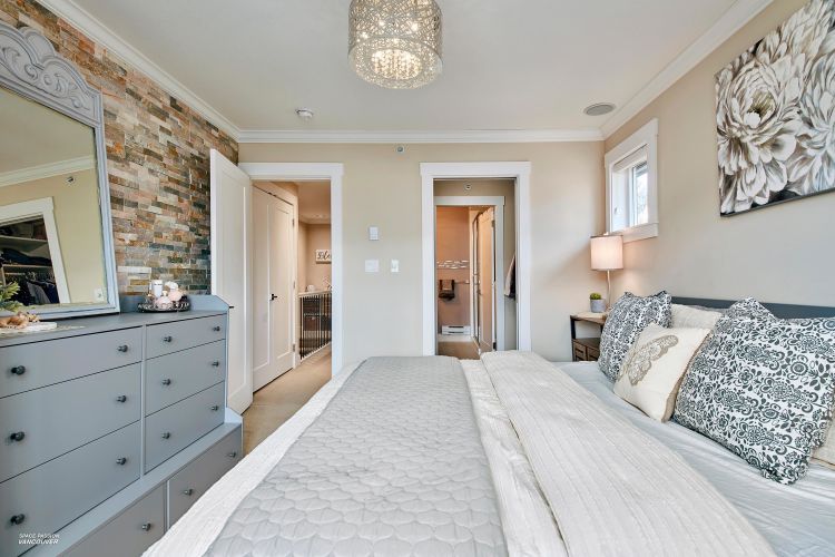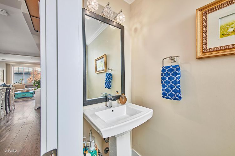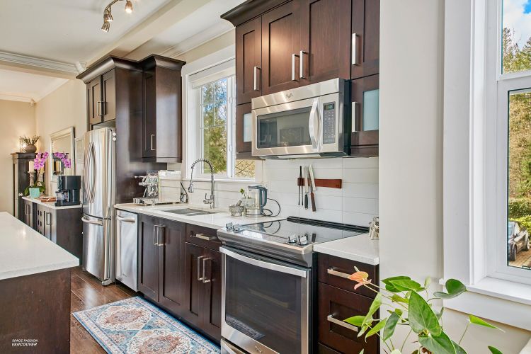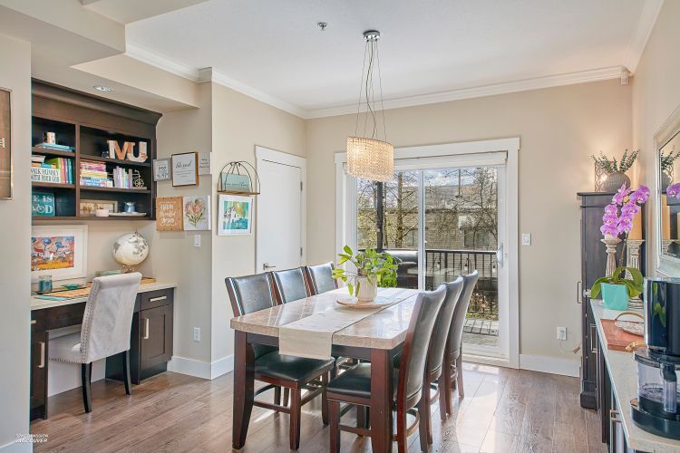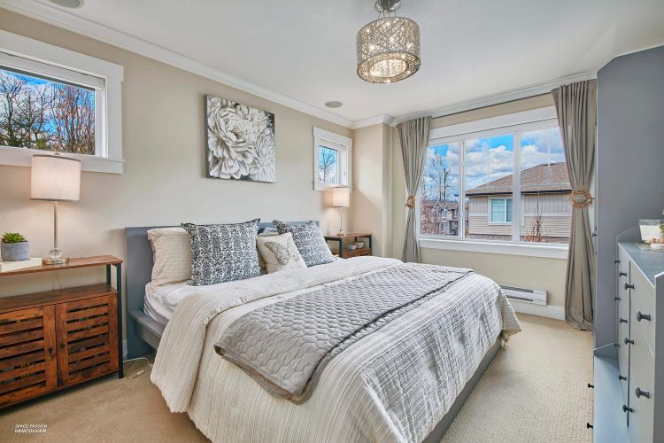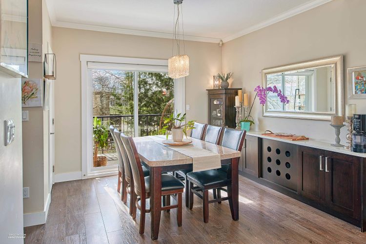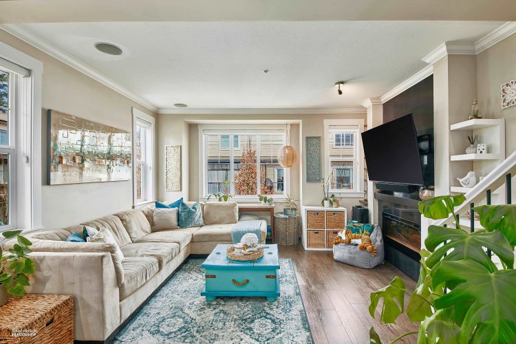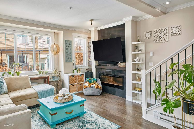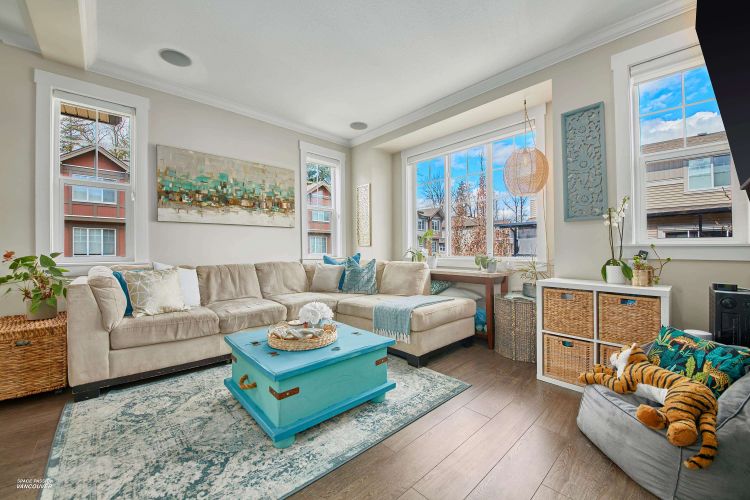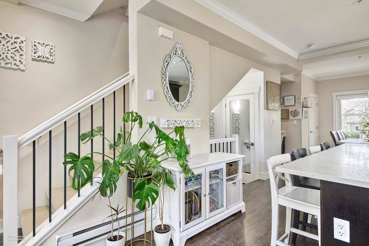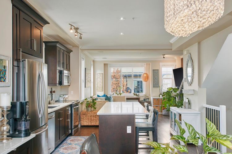 END UNIT in sought-after Albion Station! This 3 bed, 2.5 bath home offers a private fenced yard backing onto Albion Elementary and a bright south-facing patio with a custom glass awning. The open-concept main floor features an oversized island, quartz countertops, stainless steel appliances, and dark wood cabinetry. Upgrades include modern lighting, new wood flooring on the main stairs, in-ceiling speakers, cabinet pull-outs, ceiling storage racks, epoxy garage flooring, and a stunning stone feature wall in the primary bedroom. Includes 2 tandem parking spots plus driveway parking, with potential to create an additional room in the garage. Ideally located close to schools, parks, shopping, and transit.