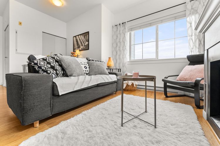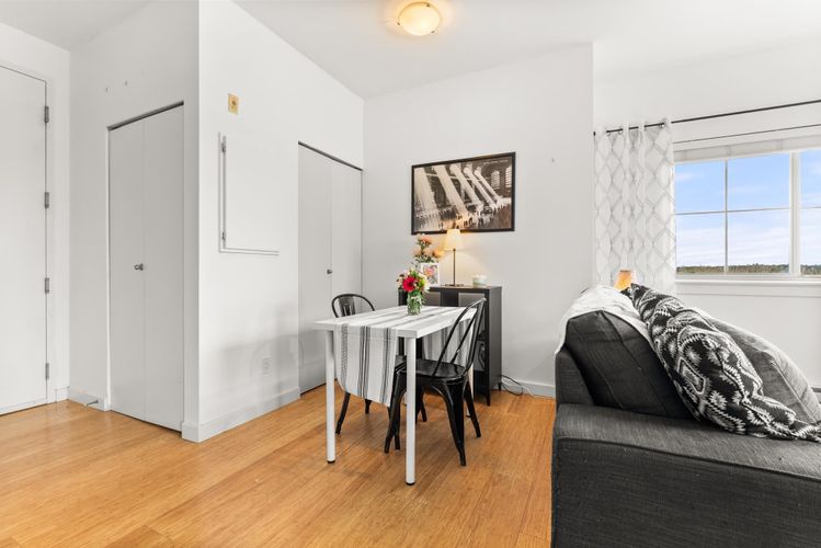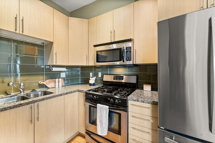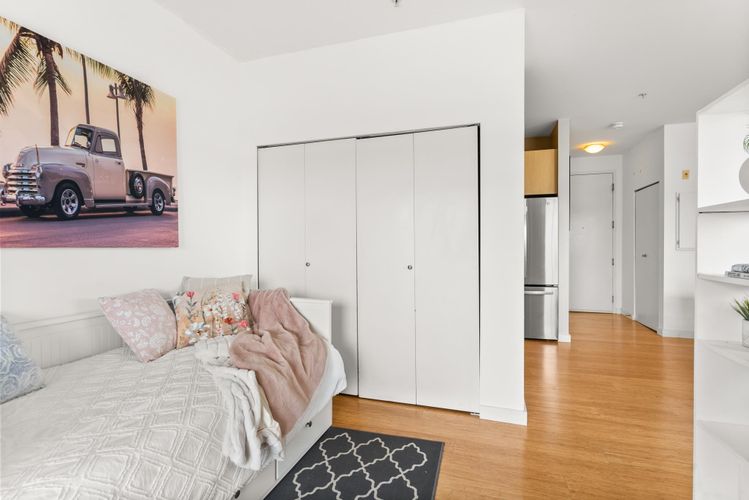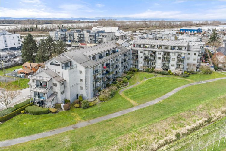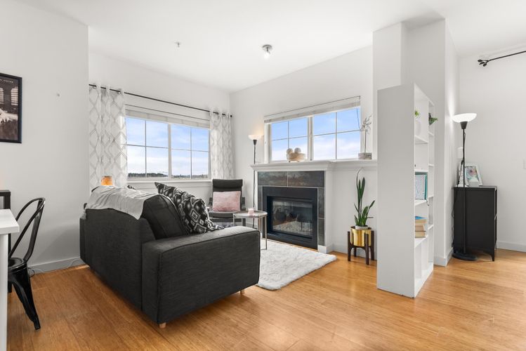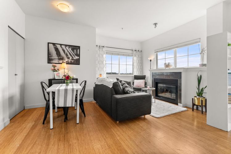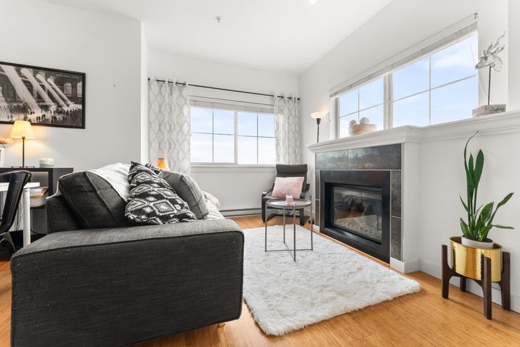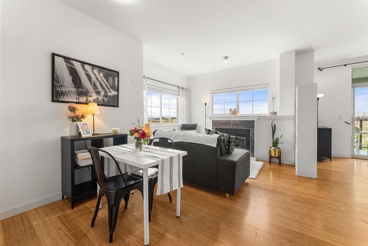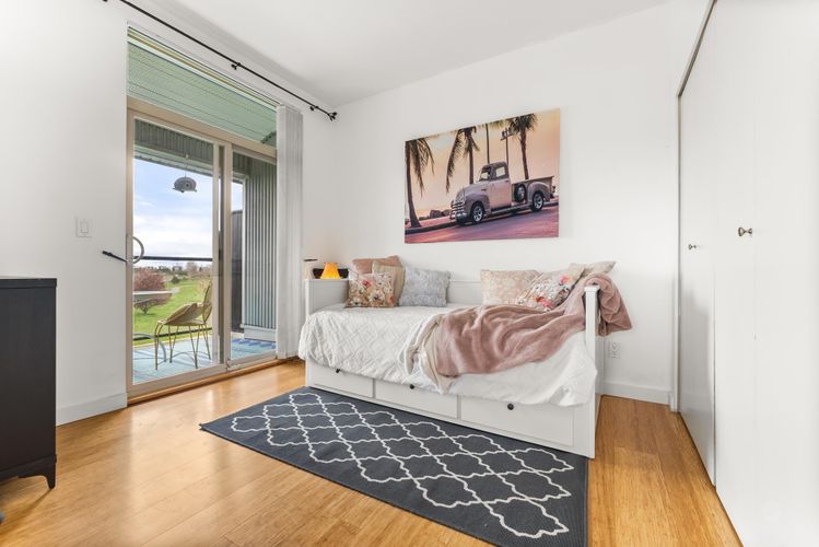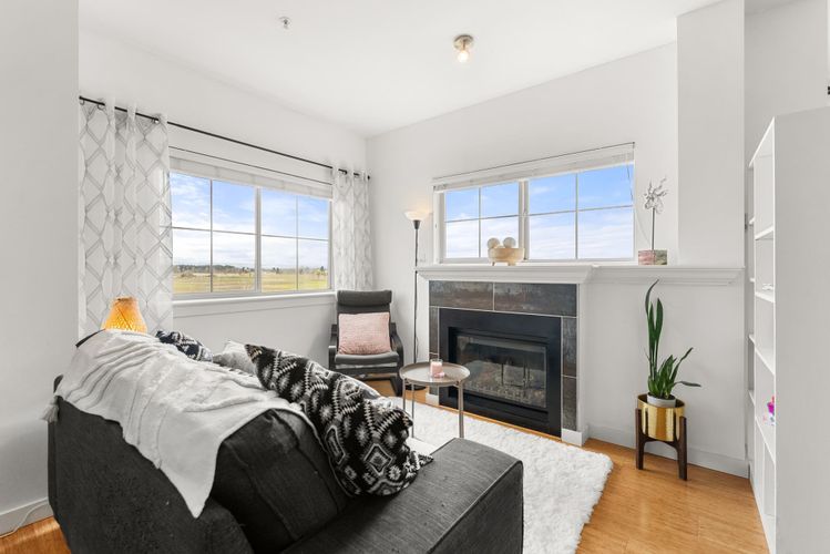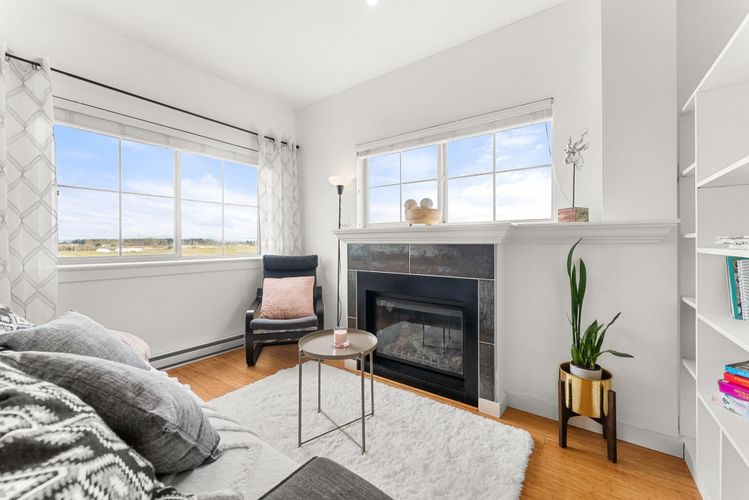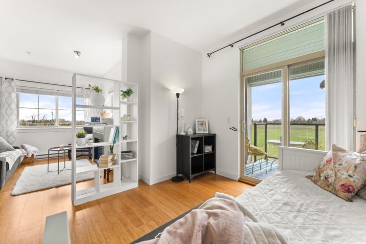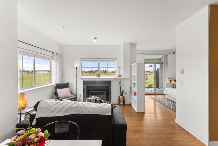 Rare opportunity in Steveston! This unique studio/bachelor suite offers stunning, unobstructed views of farmland and the North Shore Mountains from its quiet east-facing corner location. Bright and private, the open-concept layout features a functional kitchen, quality finishes, cozy gas fireplace, and in-suite laundry for everyday convenience. Step out to your private deck with a gas outlet—perfect for BBQs while enjoying the peaceful surroundings. Just steps to the dyke trails, parks, and a short stroll or bike ride to Steveston Village. Includes 1 parking stall and a generous storage locker. Don't miss out! OPEN HOUSE SUNDAY APRIL 12, 11:30-1:30