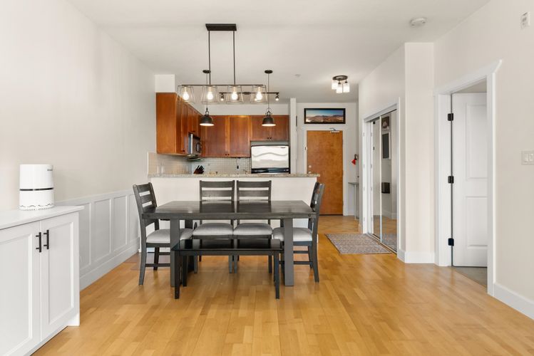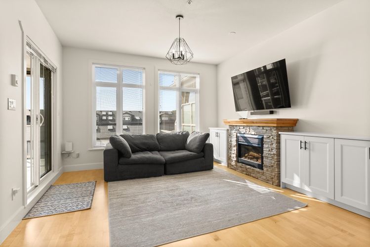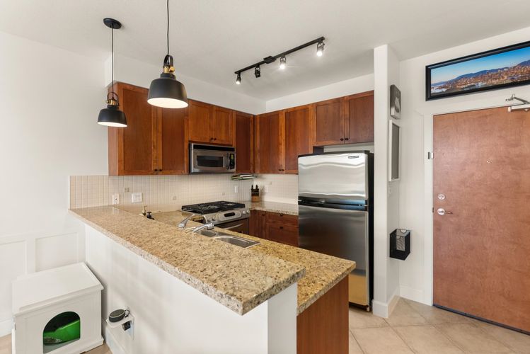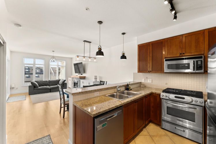 This beautifully updated 1 bdrm in the heart of Steveston Village is move in ready with an unbeatable location. A quiet unit w/ private sunset & peek a boo water views, it features open-concept living, granite counters, maple shaker cabinets, gas range, s/s appl & a cozy f/p. Large sunny private covered deck — perfect for entertaining & year round BBQing. Features new DW, W/D, hot water tank, fresh paint, sunshade, wainscoting, custom built-ins, new lighting & hardware thru-out. The well-managed, rainscreened complex underwent a full exterior renewal in 2020. Superb amenities: gym, guest suites, theatre & party room. Steps to Starbucks, SCC, restaurants, banks, the boardwalk, Garry Point, trails, transit & more! Ideal for FTHB, professionals or savvy investors looking for an A+ location.