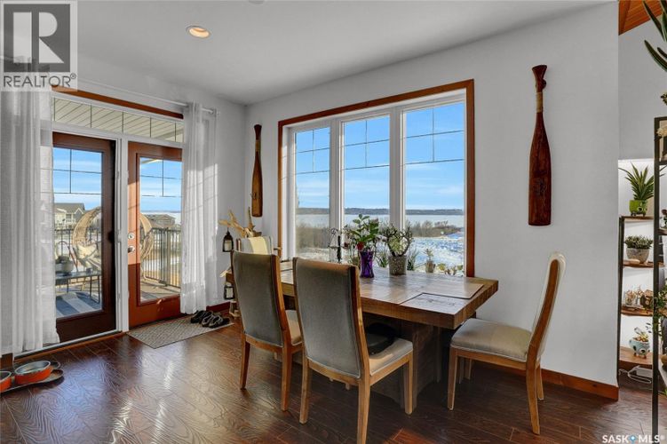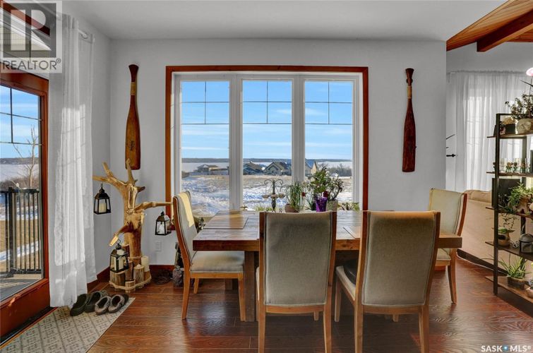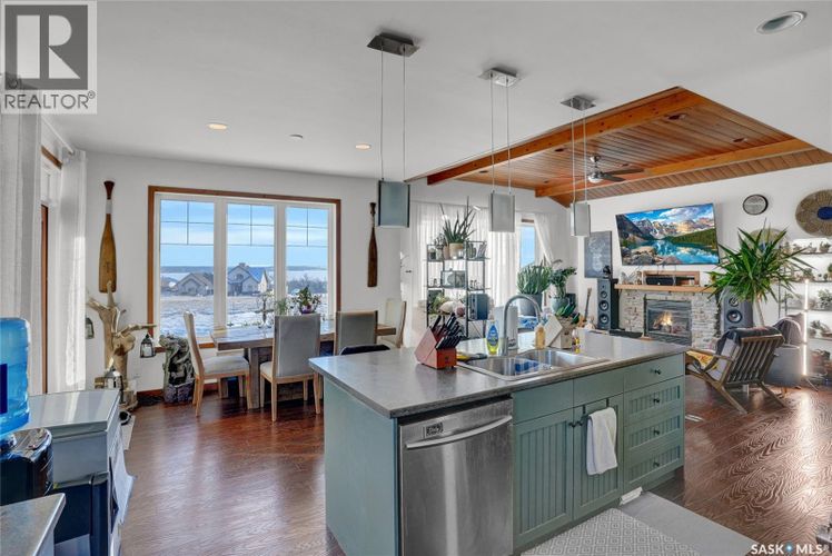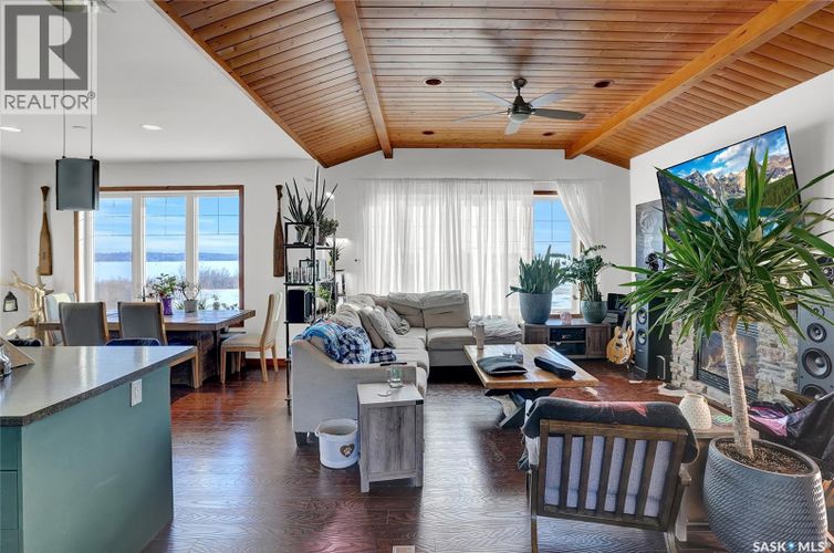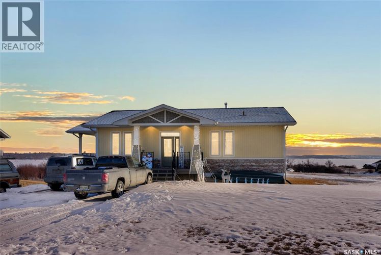 Wake up to breathtaking views of Last Mountain Lake every single day. This beautifully appointed 1,208 sq ft bungalow in the Sundale community, just steps from the water’s edge and offering lake views from nearly every room in the home. The charming curb appeal sets the tone and a warm yellow exterior make for an inviting first impression. The home sits on a generous lot with ample open space, with municipal sewer and water already connected. Step inside the open entryway that flows into the main level. The heart of the home is a spectacular open living, dining, and kitchen area anchored by vaulted ceilings with an exposed wood beam ceiling. The living room centers around a gas fireplace and features large windows that shows those incredible lake views. The kitchen is finished with sage green cabinetry, dark countertops, stainless steel appliances, and a large island, ideal for entertaining. The adjacent pantry provides exceptional storage. The dining area is perfectly positioned to take full advantage of the lake views through oversized windows, and a patio door leads directly to the covered deck and a spectacular outdoor living space overlooking the lake and surrounding community. The home offers two comfortable bedrooms, including a primary bedroom with its own ensuite and a main 4-piece bathroom complete the main floor. The basement presents an exciting opportunity, with a large open recreation room already being enjoyed as additional living space and significant potential to customize and finish to your own taste and needs. Outside, the property truly shines. Perched above Last Mountain Lake with sweeping views of the water and surrounding natural landscape. Whether you’re ice fishing in the winter, boating in the summer, or simply enjoying quiet mornings on the deck, this property delivers Saskatchewan lake lifestyle without sacrificing any modern comforts. Don’t miss your opportunity to own a slice of lakeside paradise. (id:26452)