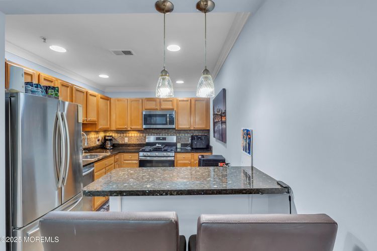 Commuter's Gem! Step into this beautiful and bright 1-bedroom, 1-bath condo featuring an open-concept layout with a warm, modern feel. The kitchen shines with granite countertops, a sleek tile backsplash, and stainless steel accents. Enjoy brand-new lifeproof laminate flooring, decorative moldings, and recessed lighting throughout that adds the perfect touch of sophistication. Relax outdoors on your private patio ideal for morning coffee or unwinding after a long day. Perfectly situated near the high-speed ferry, bus and train to NYC and just minutes from the vibrant downtown shops and restaurants. This one checks every box!