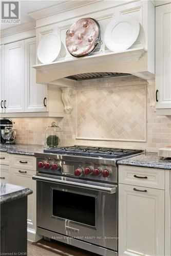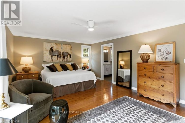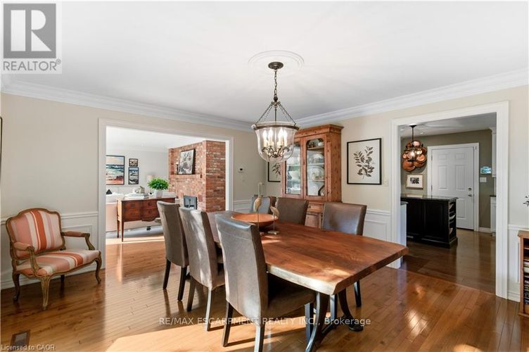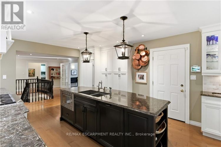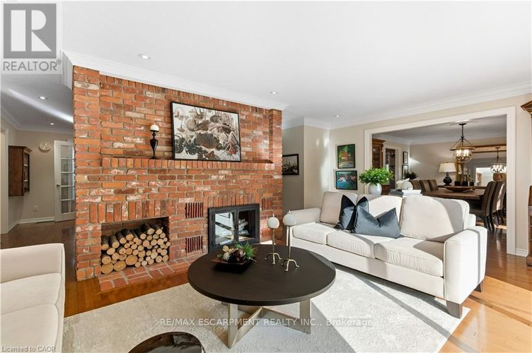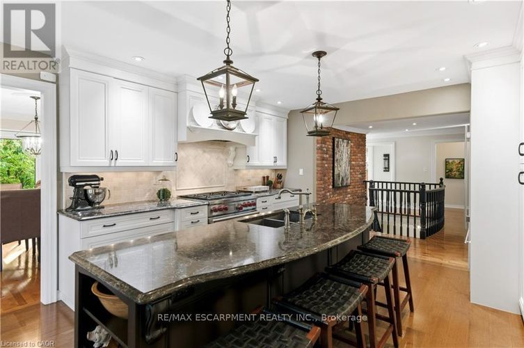 Stunning All-Brick Bungalow on a Premium Ravine Lot in South Central Waterdown. Surrounded by the protected Carolinian Forest this .66 acre property offers incredible privacy, lush views, and award-winning perennial gardens that showcase year-round beauty. The interlocking driveway, walkways, & covered patios set the tone for the homes timeless curb appeal, complemented by armour stone landscaping and space to park up to six cars. A double car garage w/ inside access ensures everyday convenience. Step inside to a welcoming foyer with slate flooring & skylights that flood the space w/ natural light. The main level boasts gleaming hardwd floors, crown moulding and a dramatic brick feature wall that adds warmth and character. The spacious living and dining rooms flow seamlessly, anchored by a wood-burning FP & a walkout to a maintenance-free deck with sunny western exposure and a retractable awningperfect for entertaining or unwinding after a long day. The custom gourmet kitchen is a true showstopper featuring two-tone cabinetry, quartz countertops, a breakfast bar island, Sub-Zero fridge, six-burner Wolf stove, coffee station w/ 2nd sink, pot lights, pendant lighting, and undercabinet lighting. A bright eat-in area completes this chefs dream space. The primary suite is a private retreat w/ W/O to the deck, a W/I closet with built-in organizers, and a spa-inspired 5-piece Ensuite. A 2nd bedrm, add'l Bathrm, and main floor laundry add convenience and flexibility to the layout. The open staircase leads to a fully finished LL w/ separate ground-level W/O, ideal for multi-generational living or an in-law setup. This level offers a family room w/ wood-burning FP, games room c/w pool table, custom wood-panelled home office, 2nd kitchen, 2 add'l bedrms & add'l full bathroom. Outside, the property continues to impress w/ multiple covered patios, sep. garden shed, and a lush forest backdrop that enhances the tranquility of this private oasis. (id:26452)