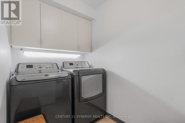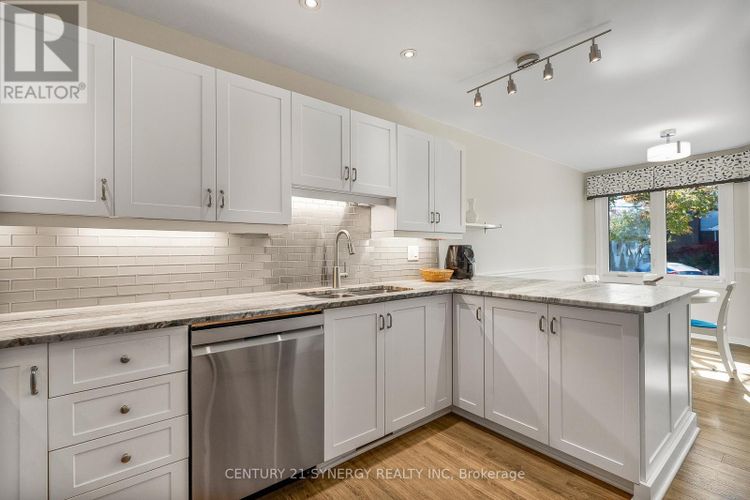 Open House Nov 9th Sunday 2-4pm. Located in the adult lifestyle community of Amberwood Village on a peaceful cul-de-sac, this is beautiful end-unit, semi-bungalow townhome with a single car garage. The home features a spacious foyer with laminate wood flooring and a double closet. The updated kitchen includes classic white cupboards, quartz countertops, stainless steel appliances, a tile backsplash, pot lighting and a breakfast area. The dining room opens to a step-down living room with a wood-burning fireplace and a vaulted ceiling that extends to the second-story loft. French doors lead from the living room to a sunny solarium, which transitions to a private 20 ft. x 16 ft. backyard deck. The main level also includes the primary bedroom with its own private en-suite bathroom. There is also a two-piece powder room, and a separate laundry room. A spiral staircase leads to the second level that features two additional bedrooms, a full bathroom, and a lounge-style loft with an overhead skylight and balcony style railing that overlooks the main living area of the home. The finished basement includes a family room, a large storage area, and a utility room. All-in-all this home has approximately 2,070 sq. ft. of living space plus the basement. The home is within walking distance of Amberwood Golf and Tennis Club, walking paths, and public transit, this home offers a blend of community connection and a peaceful retreat. It is ideal for those looking to downsize or seeking a more relaxed lifestyle. 24 hours irrevocable on all offers. (id:26452)