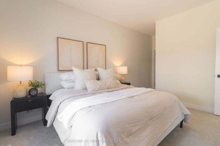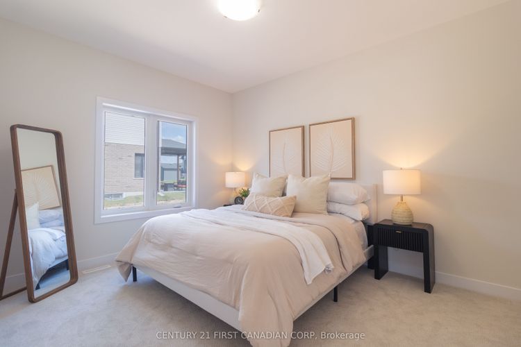 Welcome Home to the Belfort Bungalow - Rockmount Home's Final Model Home on Hayward Drive! This Home is Filled with Stunning Upgraded Features and Sits on an Astounding 63' Wide by 118' Deep Lot. Proudly Recognized for it's Quality of Craftsmanship and Finishes (Inside & Out), these Award-Winning Townhomes are sure to Impress from the Moment You Arrive. This 2 Bed, 2 Full Bath Executive Layout is thoughtfully Finished, providing 1,281 SqFt of Main Floor Living Space, plus 1,000+ SqFt of Unfinished Basement. The Main Level features an Upgraded Kitchen with Quartz Countertops, Cabinets to the Ceiling, a Stainless Steel Chimney Range Vent with a Tiled Backsplash to the Ceiling, and Golden Accents Throughout. The adjoining Dinette and Great Room complete the area, showcasing a 12' Vaulted Ceiling with an Electric Fireplace. An 8'-wide Sliding Patio Door at the Rear of the Home and Two Large Side Windows Fill the Home with Natural Light All Day Long. Engineered Hardwood and Ceramic Tile Flooring throughout the Main Level with Upgraded Carpet in the Bedrooms make for Luxurious Comfort with Every Step. Each Bungalow is Located on a Large Corner Lot with an equally Expansive Side Yard with Three Sides Fenced by Rockmount Homes! The Stone Masonry and Hardie Paneling Exterior combine Timeless Design with Performance Materials to offer Beauty & Peace of Mind. This Development is in the Vibrant Lambeth Community is Finishing Up with Limited Availability Left. Act Now to Secure Your Home with Close Access to Highways 401 & 402, Shopping Centres, Golf Courses, and Boler Mountain Ski Hill. Visit weekly Open Houses or contact the Listing Agent for a Private Showing! (id:26452)
