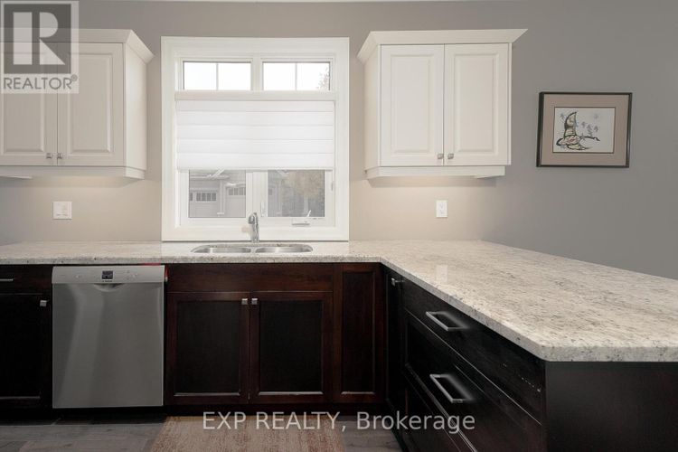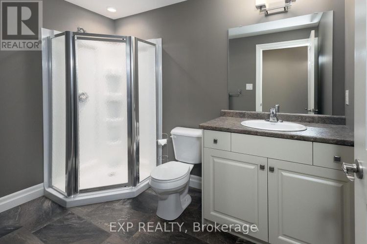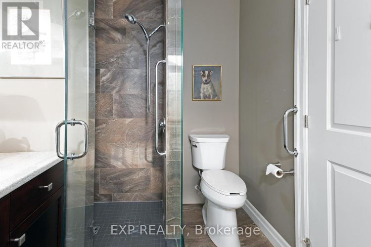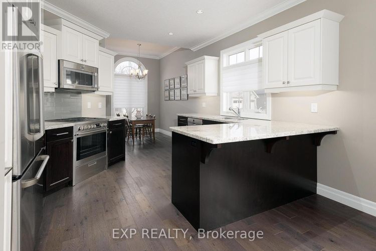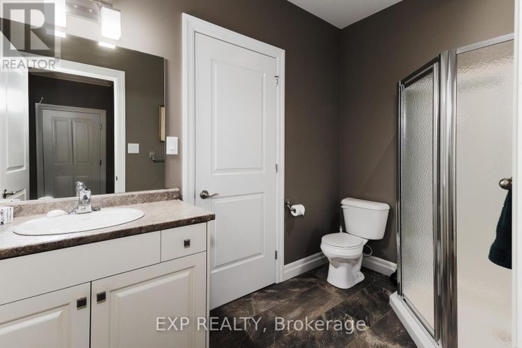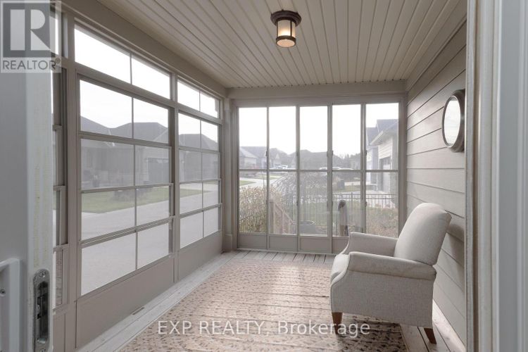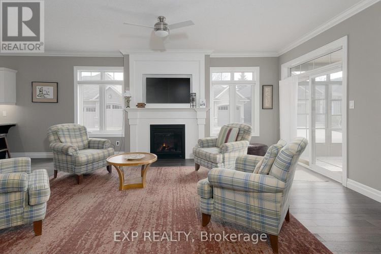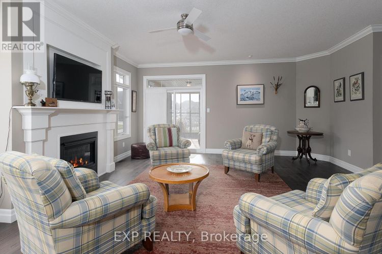 Welcome to this well-designed one-floor condo offering comfort, accessibility, and low-maintenance living in a friendly community with an exclusive common space park area and full resident access to the Thames River. Located in beautiful Dorchester, Ontario, this home offers the charm of small-town living with quick access to local parks, trails, shops, and all the conveniences of nearby London. Inside, you'll find 9 ft ceilings, crown moulding, transom windows, a covered front entry, and a bright kitchen with granite countertops, a front eating nook, built-in microwave, stainless steel fridge, gas stove, and dishwasher. The open family room includes a natural gas fireplace and walks out to a newly converted 3-season room overlooking the fenced backyard. The spacious primary bedroom offers a walk-in closet and private 4-piece ensuite with a soaker tub. Main-floor laundry with a sink, no stairs from the double garage into the home, and a chair lift to the basement adds excellent accessibility. The finished lower level includes a bedroom, 3-piece bath with shower, and a small office area, plus a large unfinished section for future development. Additional features include natural gas furnace, central air, water softener (owned). Condo fees of approximately $225-$230/month cover snow removal of roads, laneways, front sidewalks, and lawn cutting, making this the perfect low-maintenance lifestyle in a peaceful, well-kept Dorchester complex. (id:26452)