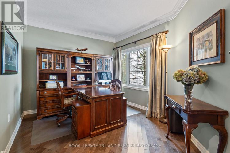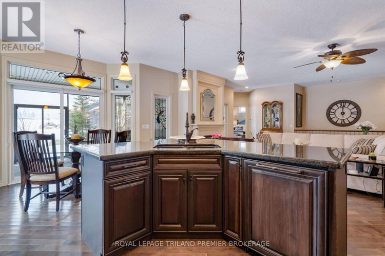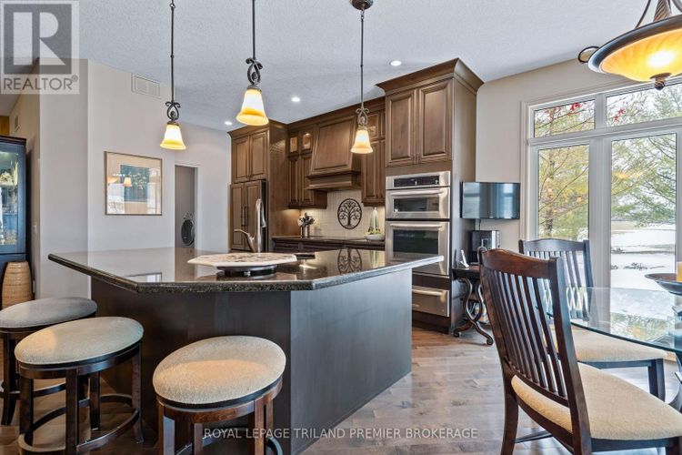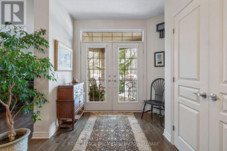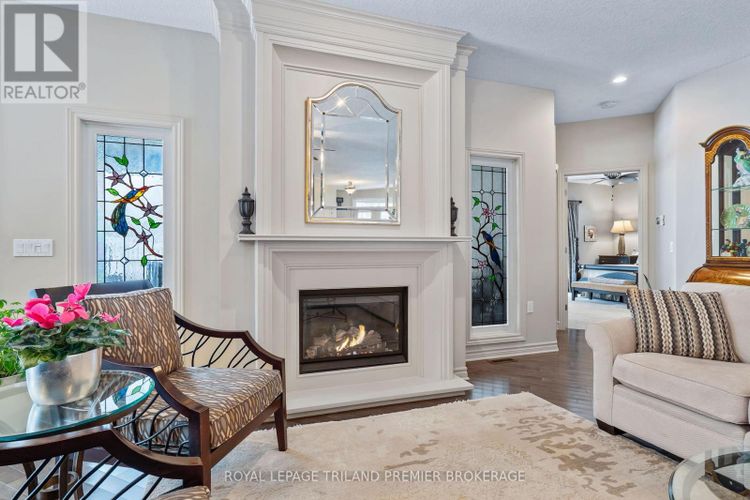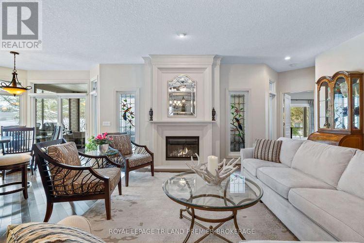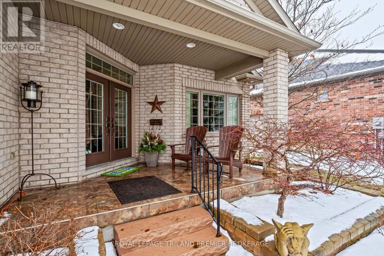 Welcome to the prestigious golf community of River Bend, where this impeccably maintained (2+1Bed 3 full bathroom) Marion Model bungalow delivers refined living from the moment you arrive. Framed by a picturesque pond and the natural beauty of Kains Woods with the 12th TBox from your front covered porch. Then head out back to a breathtaking backdrop, with sweeping views of the11th fairway and green enjoyed from the private patio or the expansive 30.6' x 14' screened rear porch. The elegant open-concept interior is thoughtfully finished with timeless, designer-selected details and upgrades throughout. Rich dark hardwood flooring, a custom kitchen, and a sophisticated blend of ceramic, granite, and marble create a seamless and elevated aesthetic that is both luxurious and inviting. The professionally finished lower level extends the living space beautifully, featuring a spacious family-sized rec room with custom built-ins, a games room perfectly sized for a pool table with wet bar, an additional bedroom, dedicated gym space, and a full bathroom. Exceptional storage throughout the home ensures effortless organization and functionality. Completing this exceptional offering is the monthly land lease and fee of ONLY $1,175.76, providing unparalleled convenience and peace of mind. This includes 24-hour gated concierge service, lawn and sprinkler maintenance, snow removal, and exclusive clubhouse privileges. An outstanding opportunity in one of the city's most desirable communities-schedule your private showing today (id:26452)